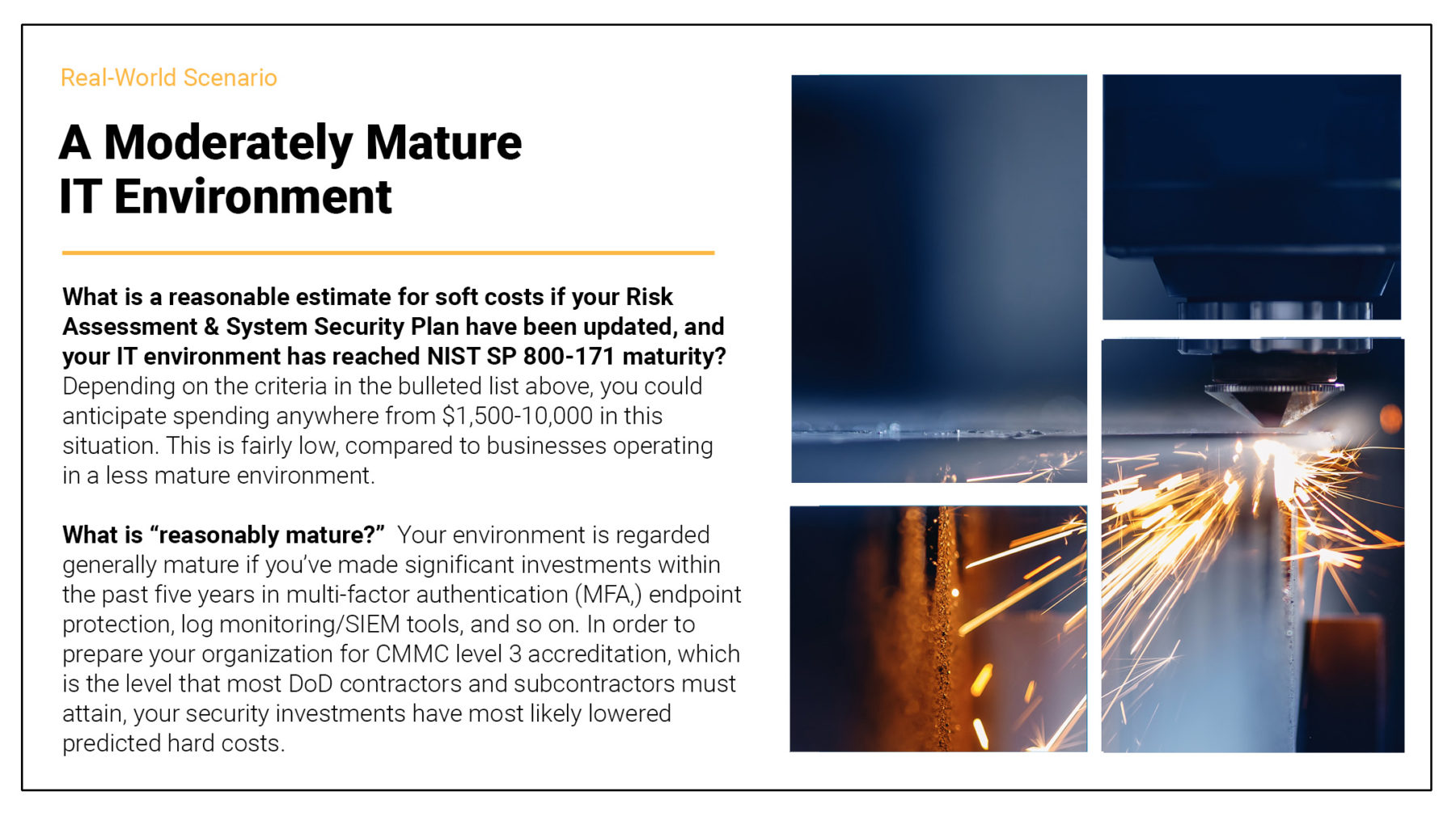 The CMMC certification is a new requirement, the costs are significant, and final cost estimates for small and mid-sized firms have yet to be calculated. It’s worth noting, however, that a portion of the CMMC certification cost can be attributed to allowable costs that are reimbursable under the DFARS rules – working with knowledgeable CMMC security experts will help to highlight several cost-effective measures for the CMMC compliance process.
